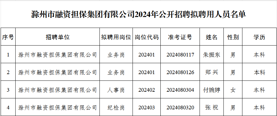 滁州市融資擔保集團有限公司2024年公開招聘擬聘用人員公示