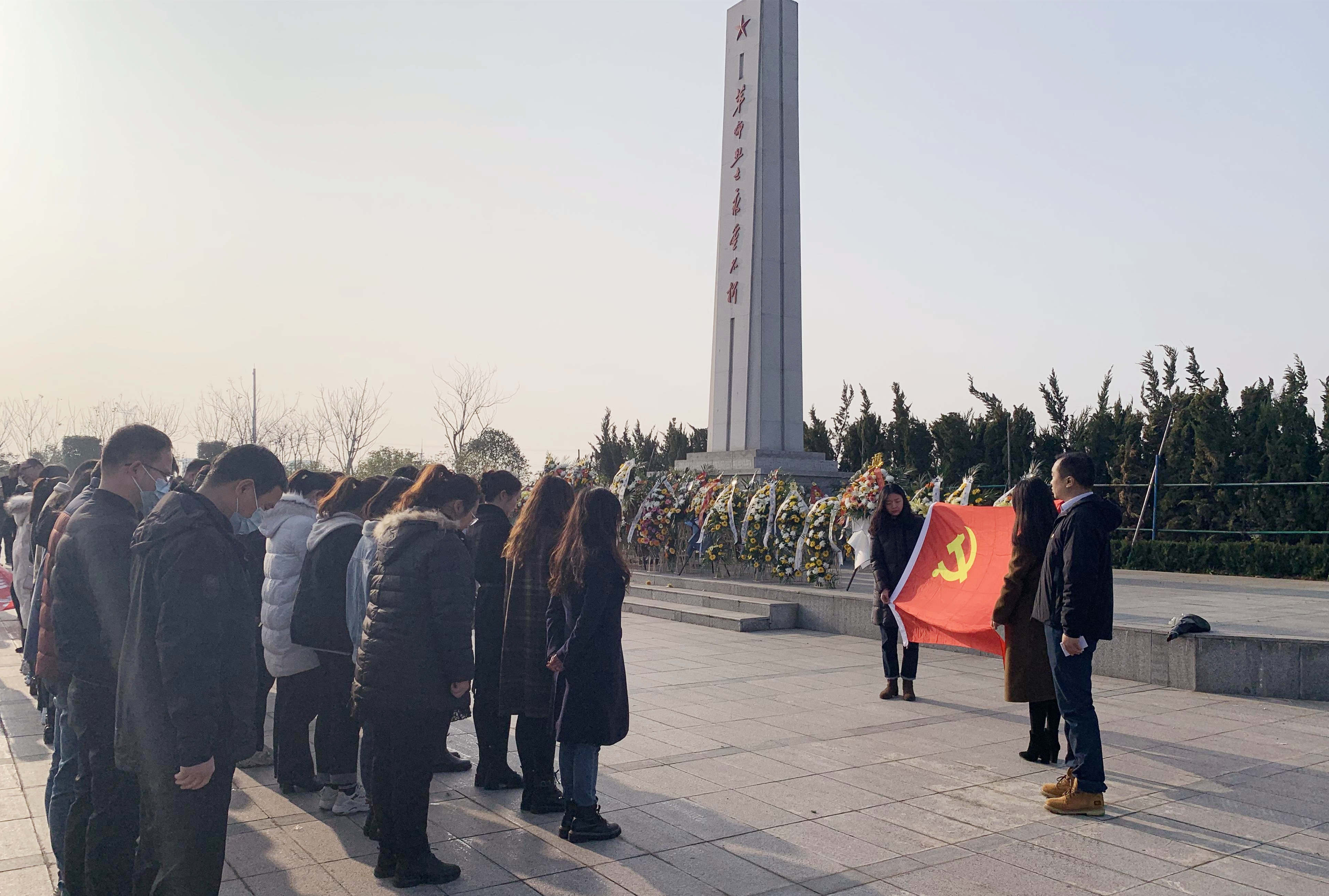 在革命烈士紀念碑前,黨員代表敬獻花籃,全體人員低頭默哀致敬,表達對受難同胞的哀思和對烈士的敬仰。面對鮮紅黨旗,全體人員重溫入黨誓詞,銘記作為一名共產黨員所肩負的責任和使命。