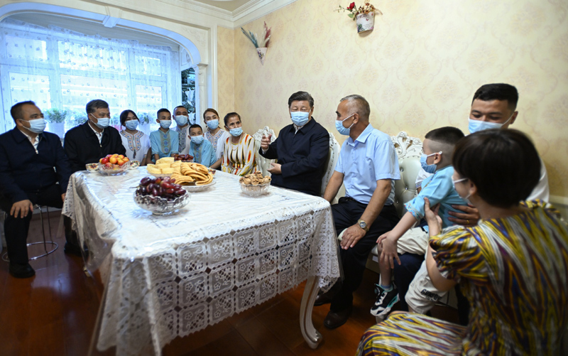 7月12日至15日,中共中央總書記、國家主席、中央軍委主席習(xí)近平在新疆考察。這是13日上午,習(xí)近平在烏魯木齊市天山區(qū)固原巷社區(qū),同維吾爾族居民阿布來提·吐爾遜一家人圍坐在一起拉家常。新華社記者 謝環(huán)馳 攝