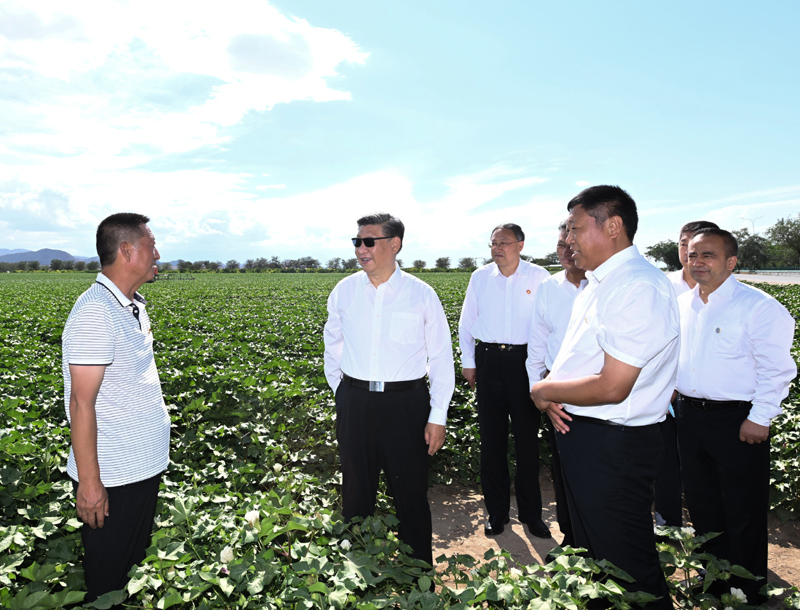 7月12日至15日,中共中央總書記、國家主席、中央軍委主席習(xí)近平在新疆考察。這是13日下午,習(xí)近平在新疆生產(chǎn)建設(shè)兵團(tuán)八師一四三團(tuán)農(nóng)一連棉花種植基地考察。新華社記者 謝環(huán)馳 攝