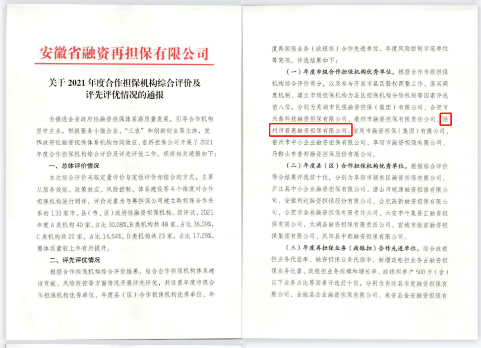 市普惠擔(dān)保公司榮獲安徽省2021年度市級(jí)合作擔(dān)保機(jī)構(gòu)優(yōu)秀單位