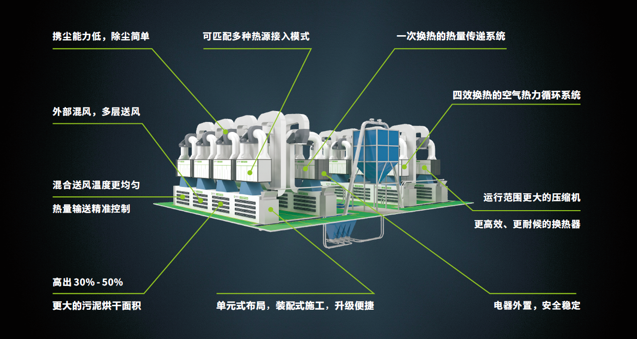 綠潤(rùn)科技ICDS智能干化系統(tǒng)應(yīng)運(yùn)而生:此產(chǎn)品可匹配多種熱源接入模式,采用運(yùn)行范圍更大的壓縮機(jī),更高效、更耐候的換熱器;運(yùn)用外部混風(fēng)、多層送風(fēng)技術(shù),使混合送風(fēng)溫度更均勻、熱量輸送控制更精準(zhǔn),在此精準(zhǔn)控風(fēng)的環(huán)境下,設(shè)備攜塵能力更低,除塵更簡(jiǎn)單,有效控制粉塵問(wèn)題;同時(shí)采用比普通高出30%-50%的大型鏈網(wǎng),具有更大的污泥烘干面積,配合一次換熱的熱量傳遞系統(tǒng)、四效換熱的空氣熱力循環(huán)系統(tǒng),干化系統(tǒng)能效有了顯著的提升;整體設(shè)備采用單元式布局,大大降低設(shè)備占地面積,空間利用率高,全套系統(tǒng)采用裝配式施工,方便快捷,符合綠色建筑的要求,節(jié)能環(huán)保。